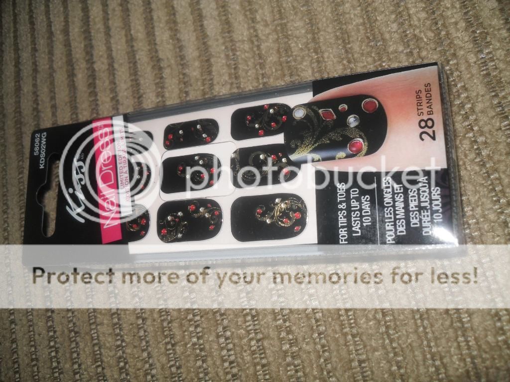 I was lucky enough to receive these Kiss Nail dress strips in my Influenster Holiday Voxbox. I've wanted to try these forever and I'm glad I got to try these before buying, because I have a love/hate relationship with them so far! They came in this cute black design that was perfect for me to try out for Christmas. If you don't know about Kiss, they are a global brand,with products including nail care, cosmetics, appliance, hair care, and salon & spa equipment. The nail dresses come in various designs. I received the black, paisley like ones with red beads and gold trim. Oddly enough they didn't have an actual name.