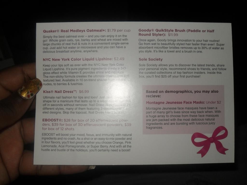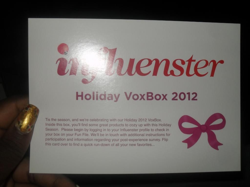 Soo, being on hiatus I didn't get to talk about my Influenster Holiday Box. So, I thought I'd do a quick post about it and I only chose 3 items to review later. So here's what I got and the details.